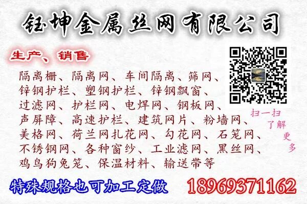 金华市钰坤金属丝网有限公司生产销售隔离栅、隔离网、车间隔离、筛网、锌钢护栏、塑钢护栏、锌钢飘窗、声屏障、高速护栏、建筑网片、粉墙网、过滤网等产品,特殊规格加工定做,品种齐全、价格合理。