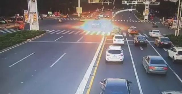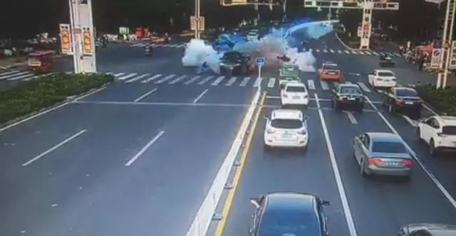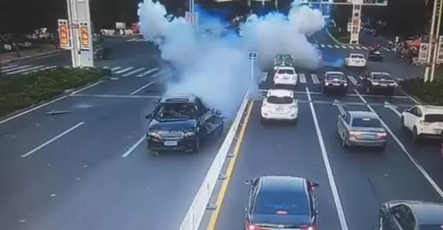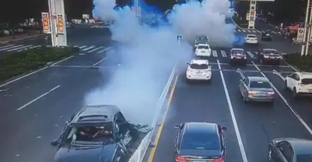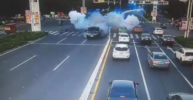 一辆路虎行等红灯后驶到十字路口时发生爆炸